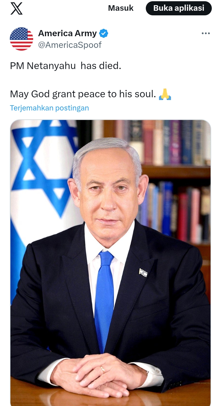 Akun centang biru bernama America Army dengan nama pengguna @AmericaSpoof itu menuliskan kabar yang menyebut Netanyahu telah tewas. Unggahan tersebut kemudian viral dan memicu berbagai reaksi warganet.