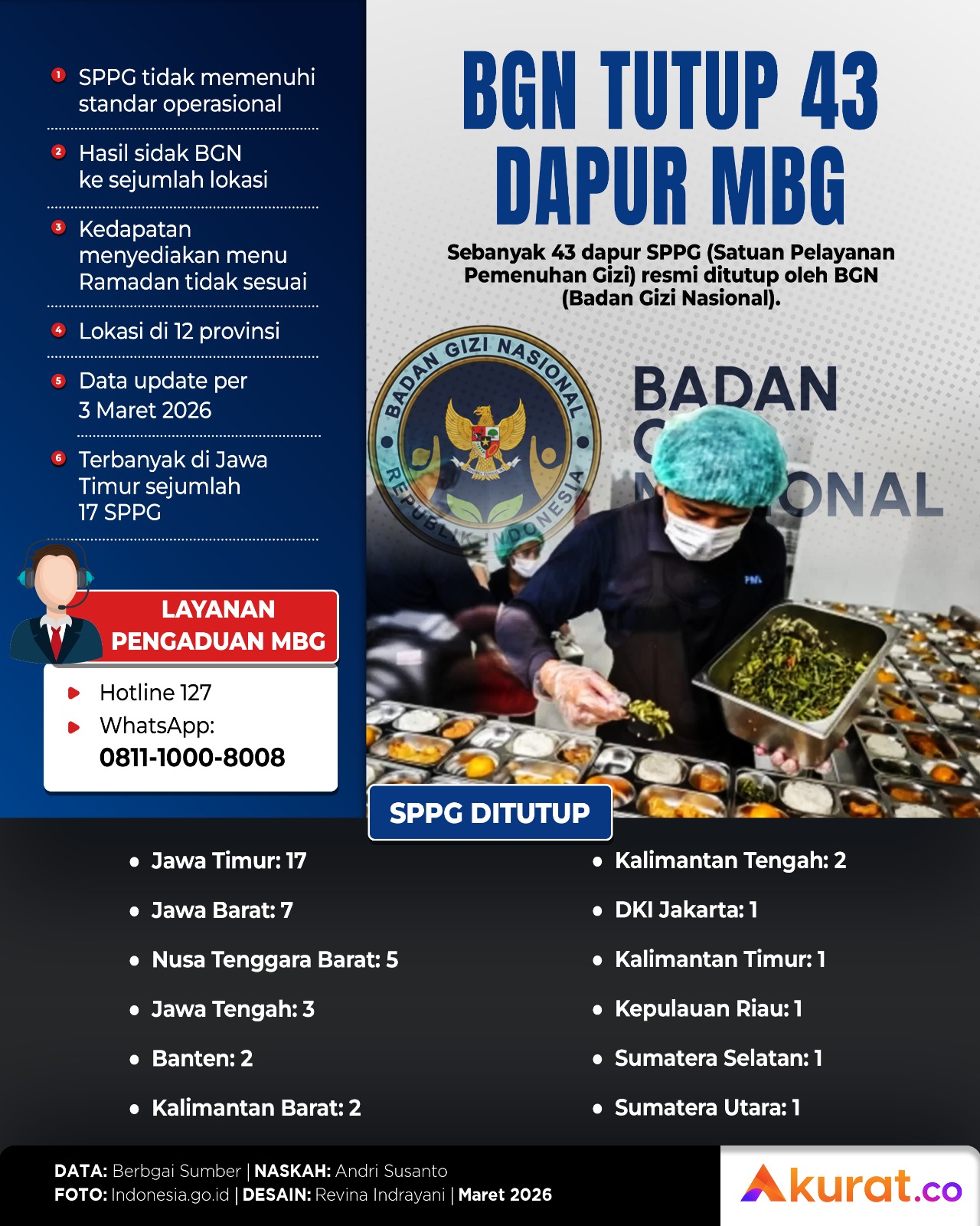 Badan Gizi Nasional menutup sebanyak 43 Satuan Pelayanan Pemenuhan Gizi (SPPG) atau dapur MBG.