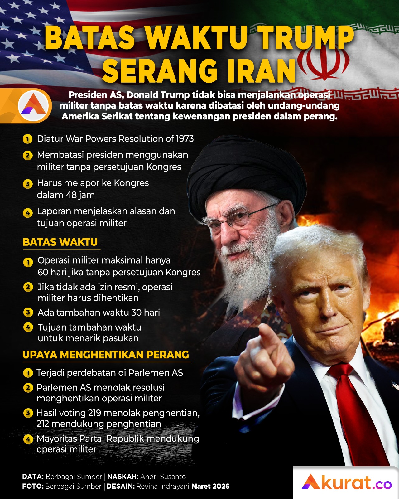Presiden AS, Donald Trump, tidak bisa menjalankan operasi militer tanpa batas waktu karena dibatasi undang-undang tentang kewenangan Presiden AS dalam perang.