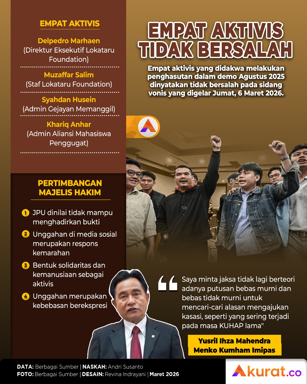 Empat aktivis yang didakwa melakukan penghasutan dalam demo Agustus 2025 dinyatakan tidak bersalah pada sidang vonis yang digelar Jumat (6/3/2026).