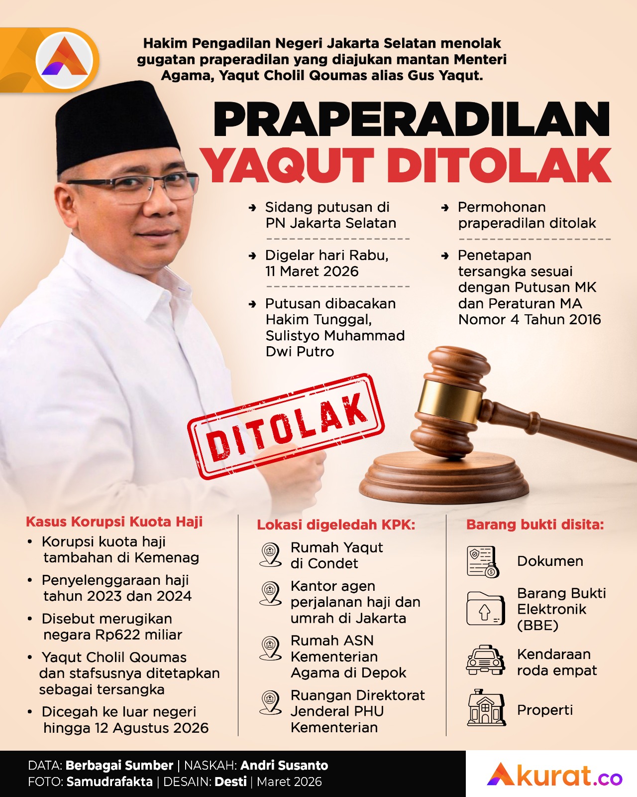 Hakim Pengadilan Negeri Jakarta Selatan menolak gugatan praperadilan yang diajukan mantan Menteri Agama, Yaqut Cholil Qoumas alias Gus Yaqut.