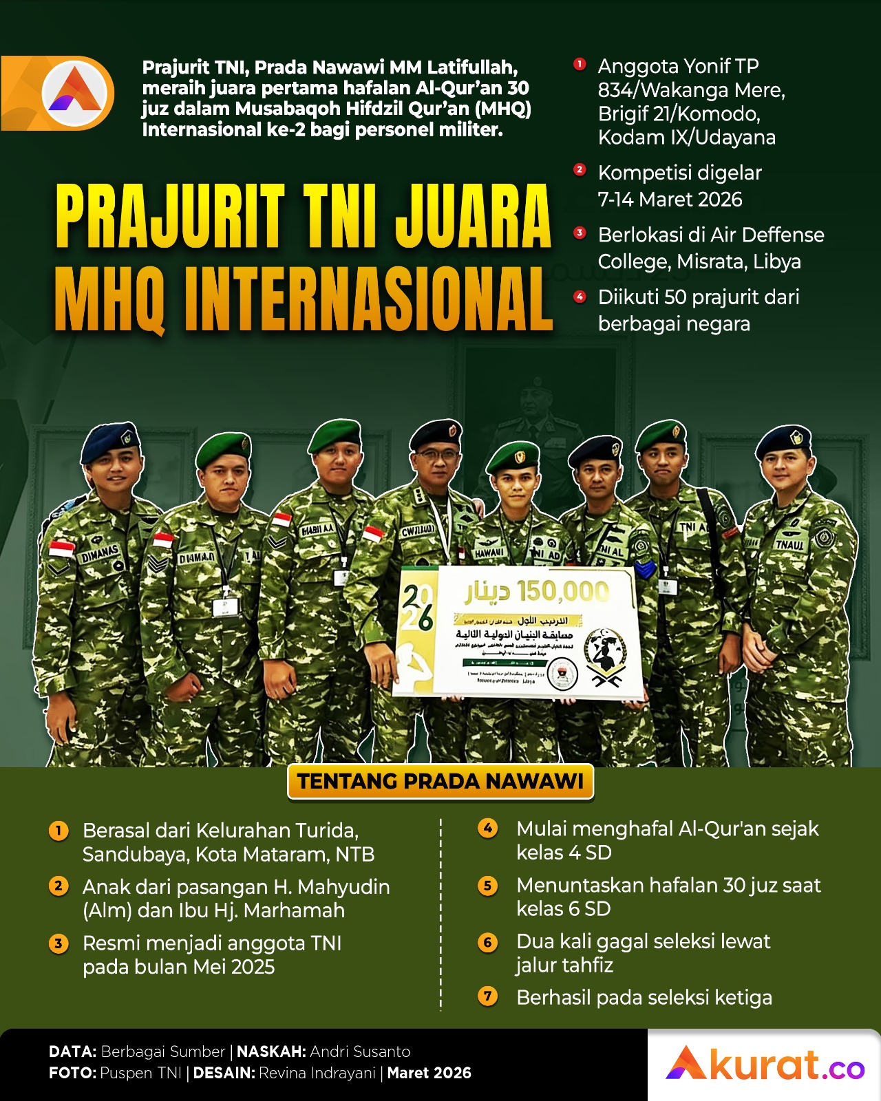Prajurit TNI AD, Prada Nawawi MM Latifullah, meraih juara satu hafalan Al-Qur'an 30 juz dalam Musabaqoh Hifdzil Qur'an Internasional bagi personel militer.