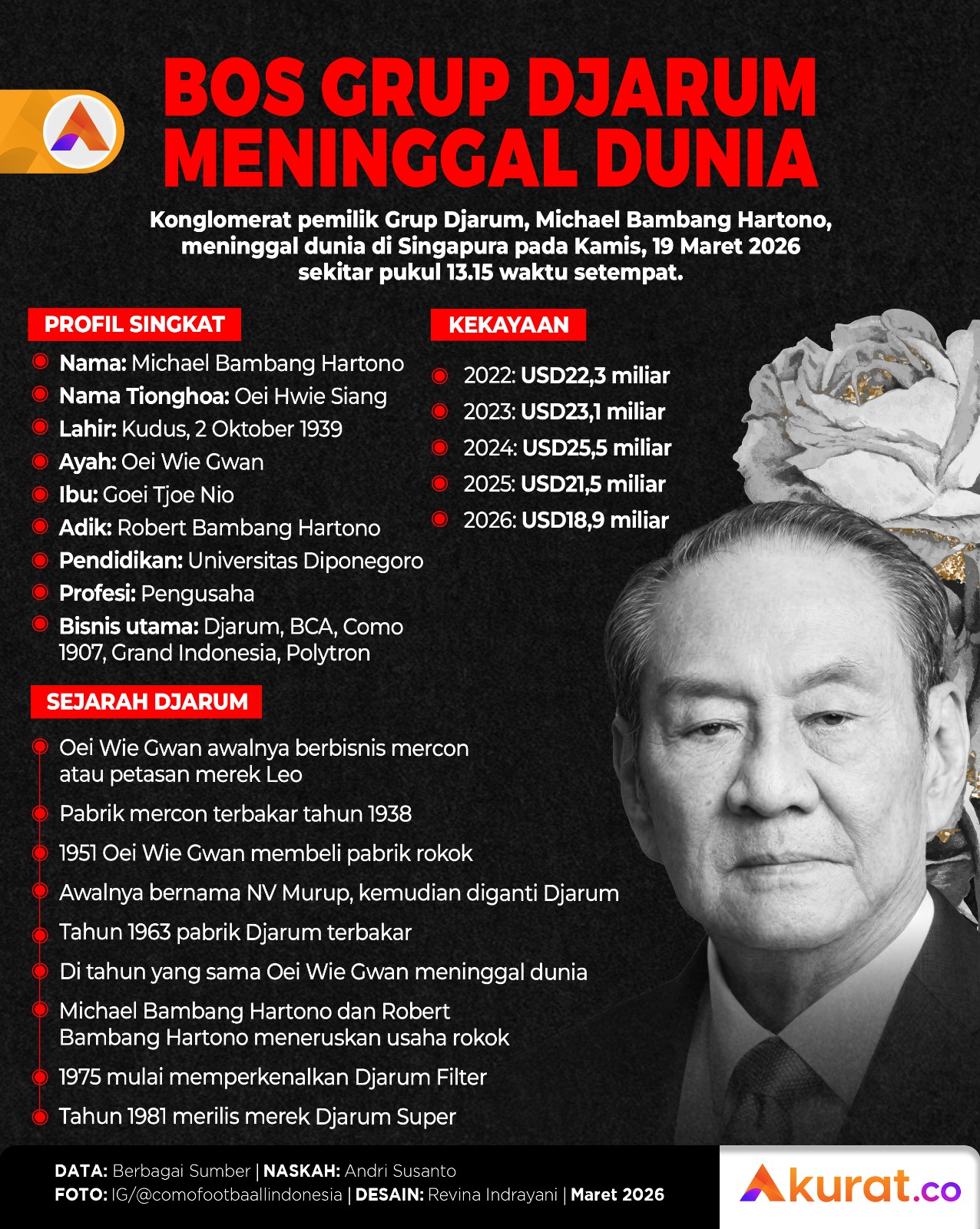 Konglomerat pemilik Grup Djarum, Michael Bambang Hartono, meninggal dunia di Singapura pada Kamis, 19 Maret 2026.