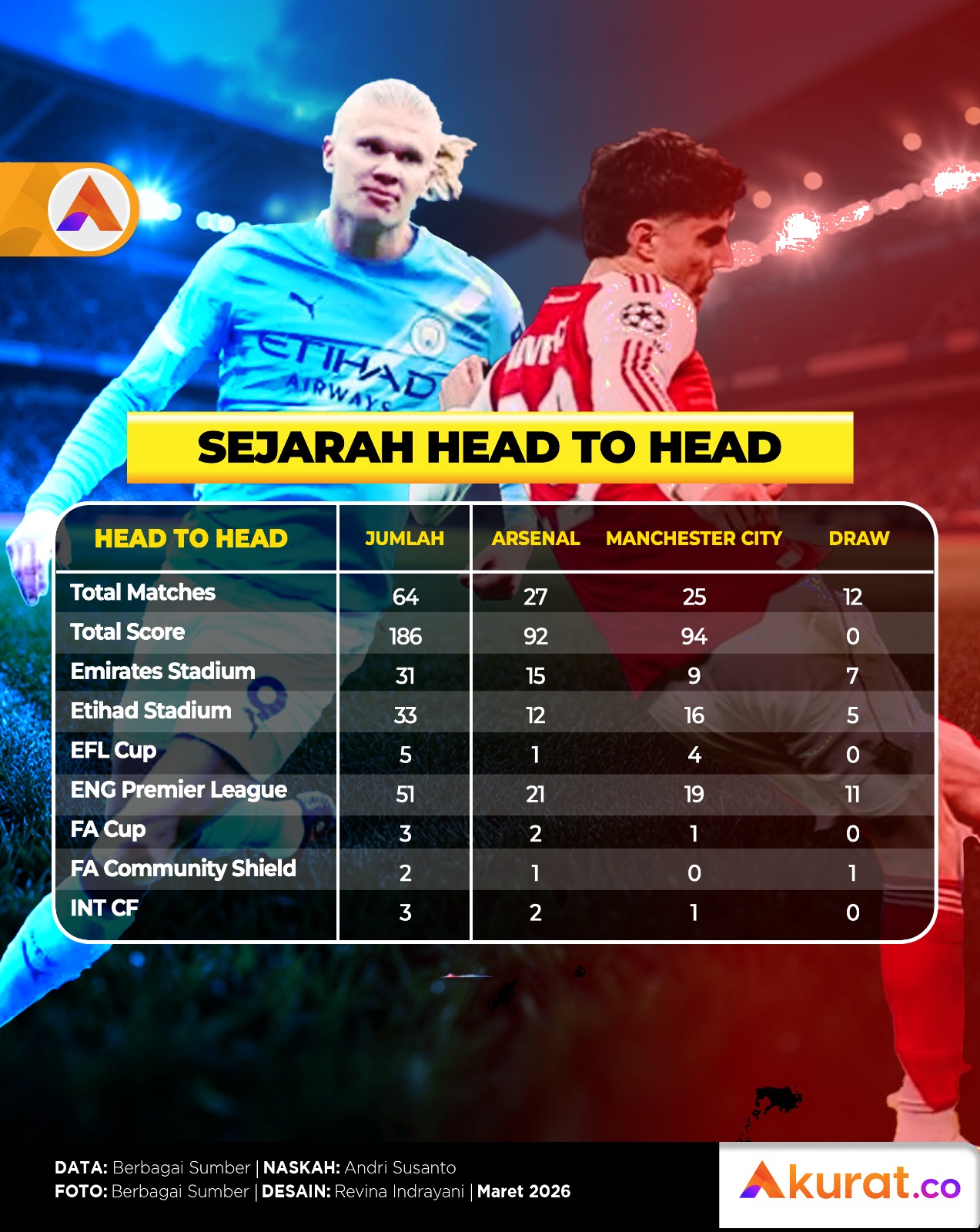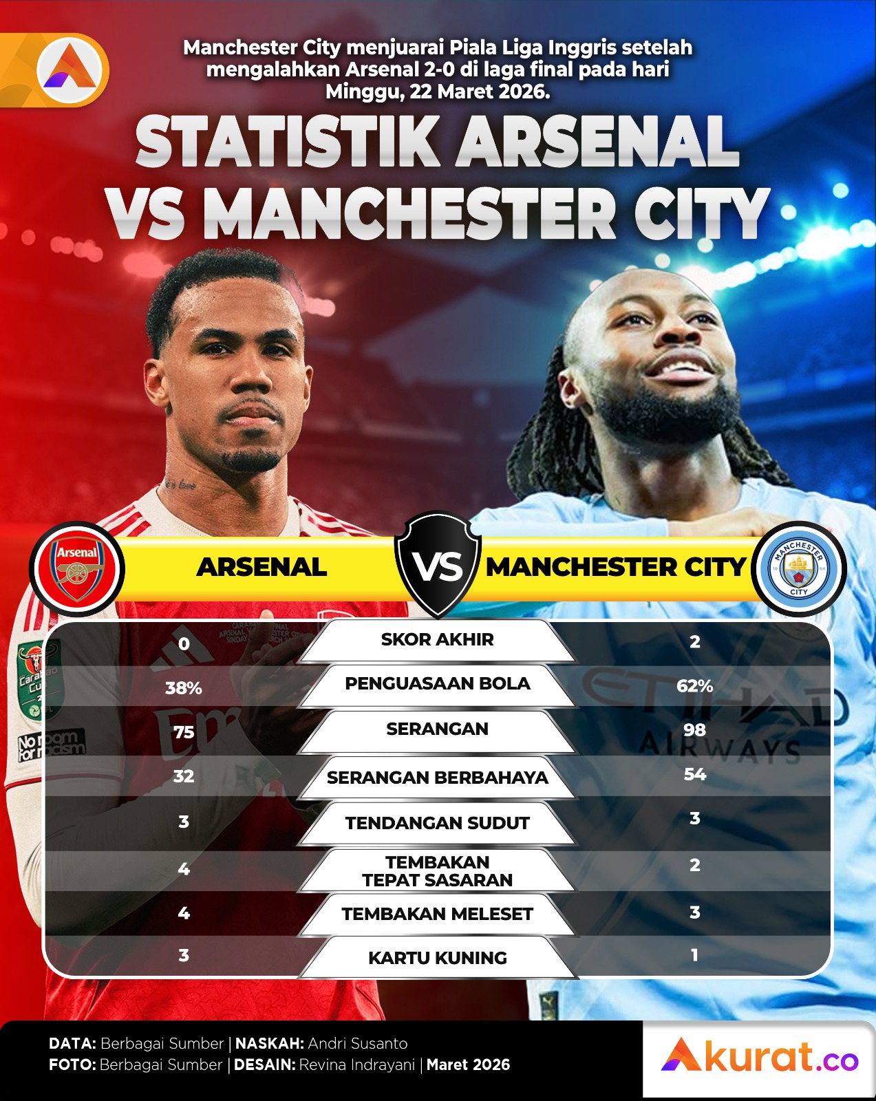 Manchester City menjuarai Piala Liga Inggris alias Carabao Cup setelah mengalahkan Arsenal, 2-0, di laga final pada Minggu, 22 Maret 2026.