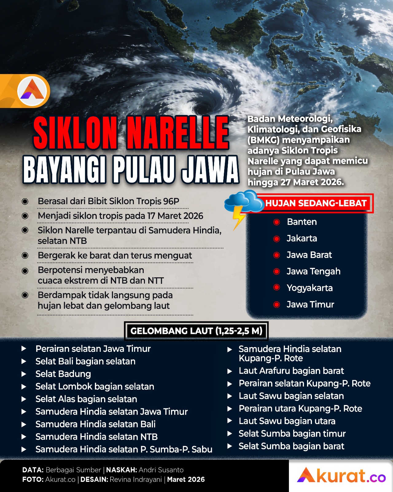 BMKG menyampaikan adanya Siklon Tropis Narelle yang dapat memicu hujan di Pulau Jawa hingga 27 Maret 2026.