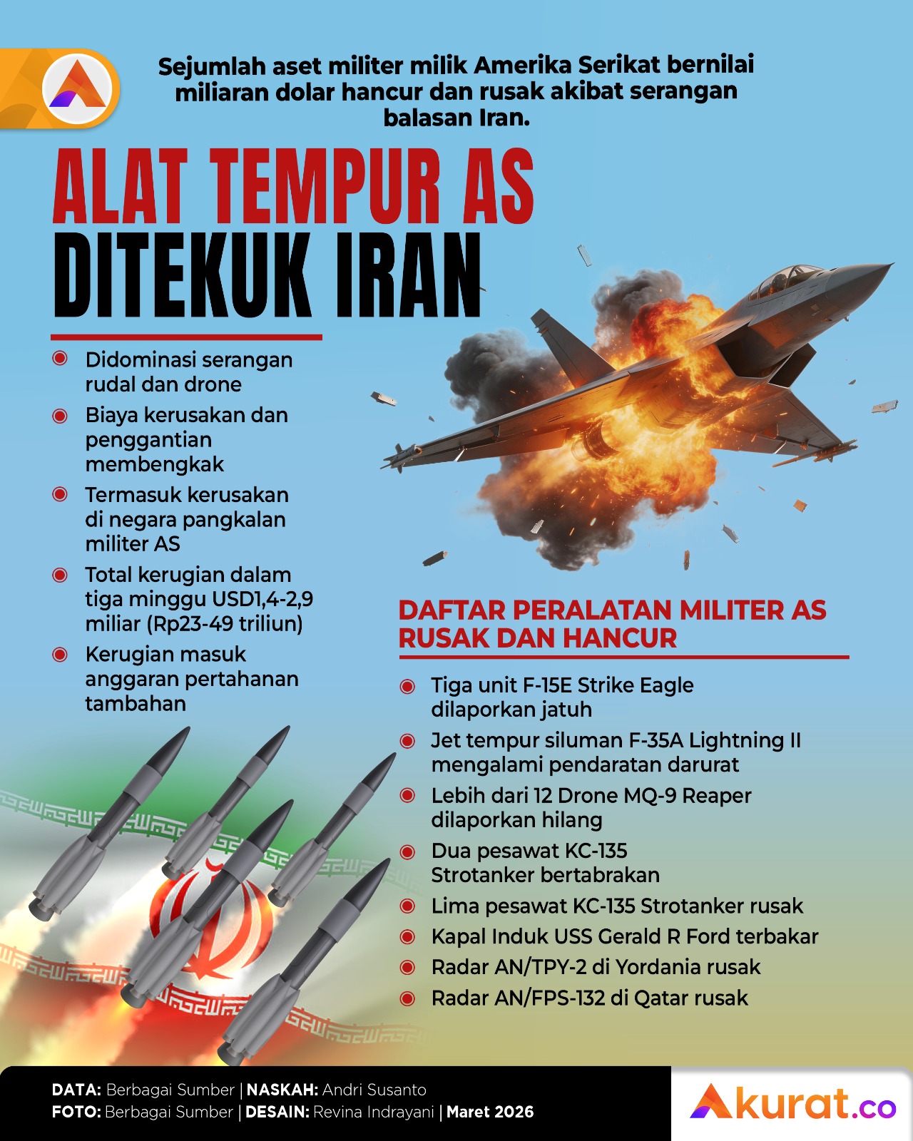 Berbagai aset militer milik Amerika Serikat bernilai miliaran dolar hancur dan rusak akibat serangan balasan Iran.