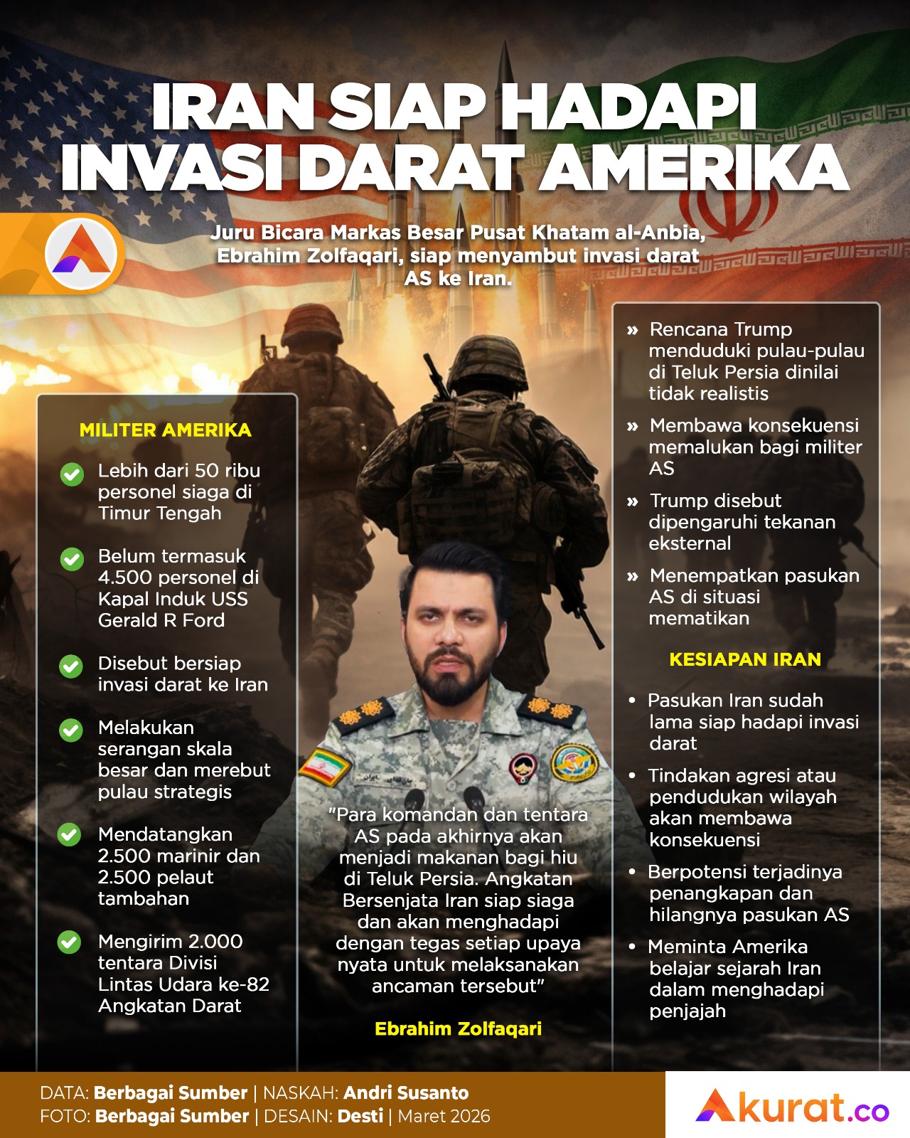 Juru Bicara Markas Besar Pusat Khatam al-Anbia, Ebrahim Zolfaqari, menyatakan siap menyambut invasi darat AS ke Iran.