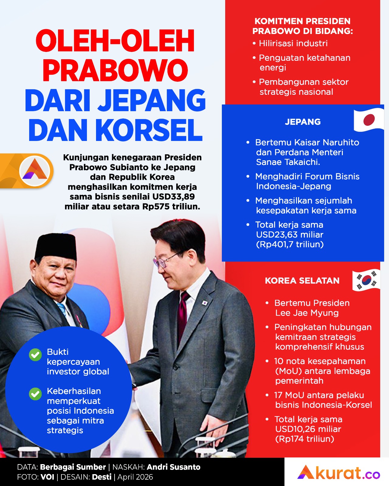 Kunjungan kenegaraan Presiden Prabowo Subianto ke Jepang dan Republik Korea menghasilkan komitmen kerja sama bisnis senilai USD33,89 miliar atau setara Rp575 triliun.
