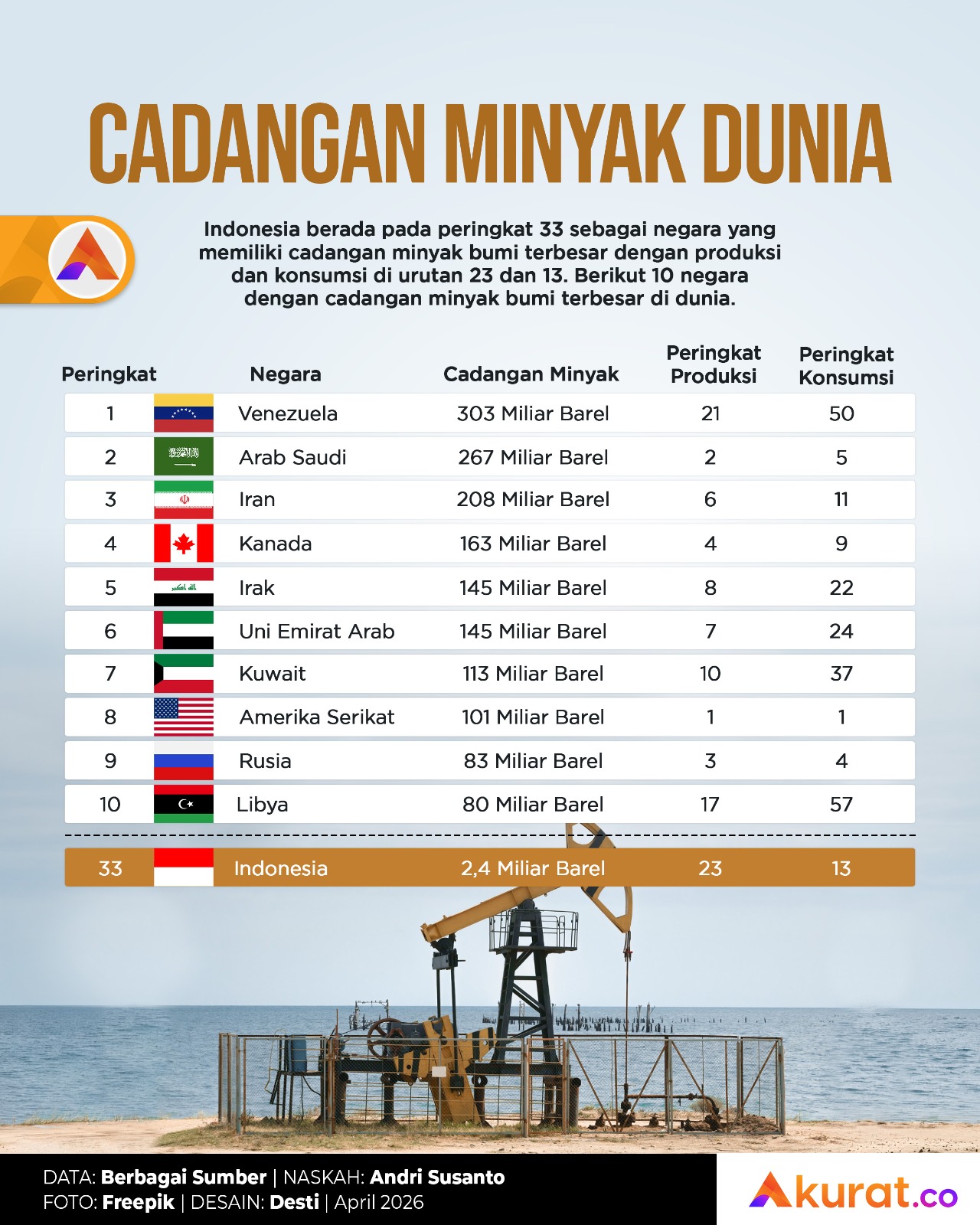 Indonesia berada pada peringkat 33 sebagai negara yang memiliki cadangan minyak bumi terbesar dengan produksi dan konsumsi di urutan 23 dan 13. Berikut 10 negara dengan cadangan minyak bumi terbesar di dunia.