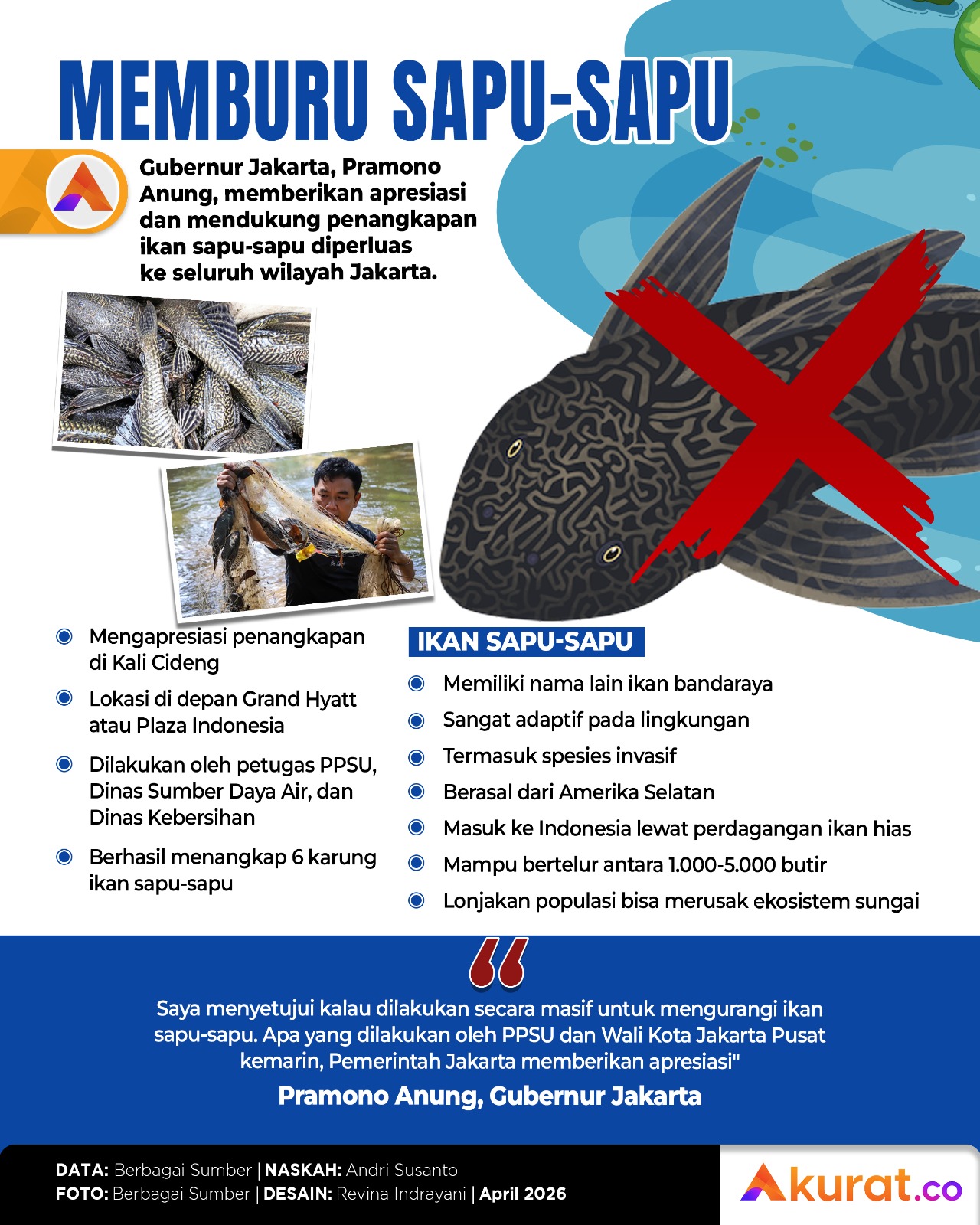 Gubernur Jakarta, Pramono Anung, memberi apresiasi dan mendukung pembersihan ikan sapu-sapu di seluruh aliran sungai.