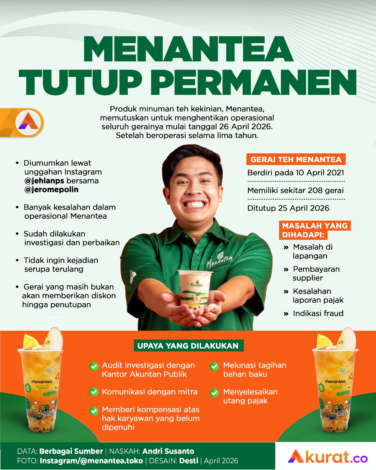 Produk minuman teh kekinian, Menantea, memutuskan untuk menghentikan operasional seluruh gerainya mulai tanggal 26 April 2026. Setelah beroperasi selama lima tahun.