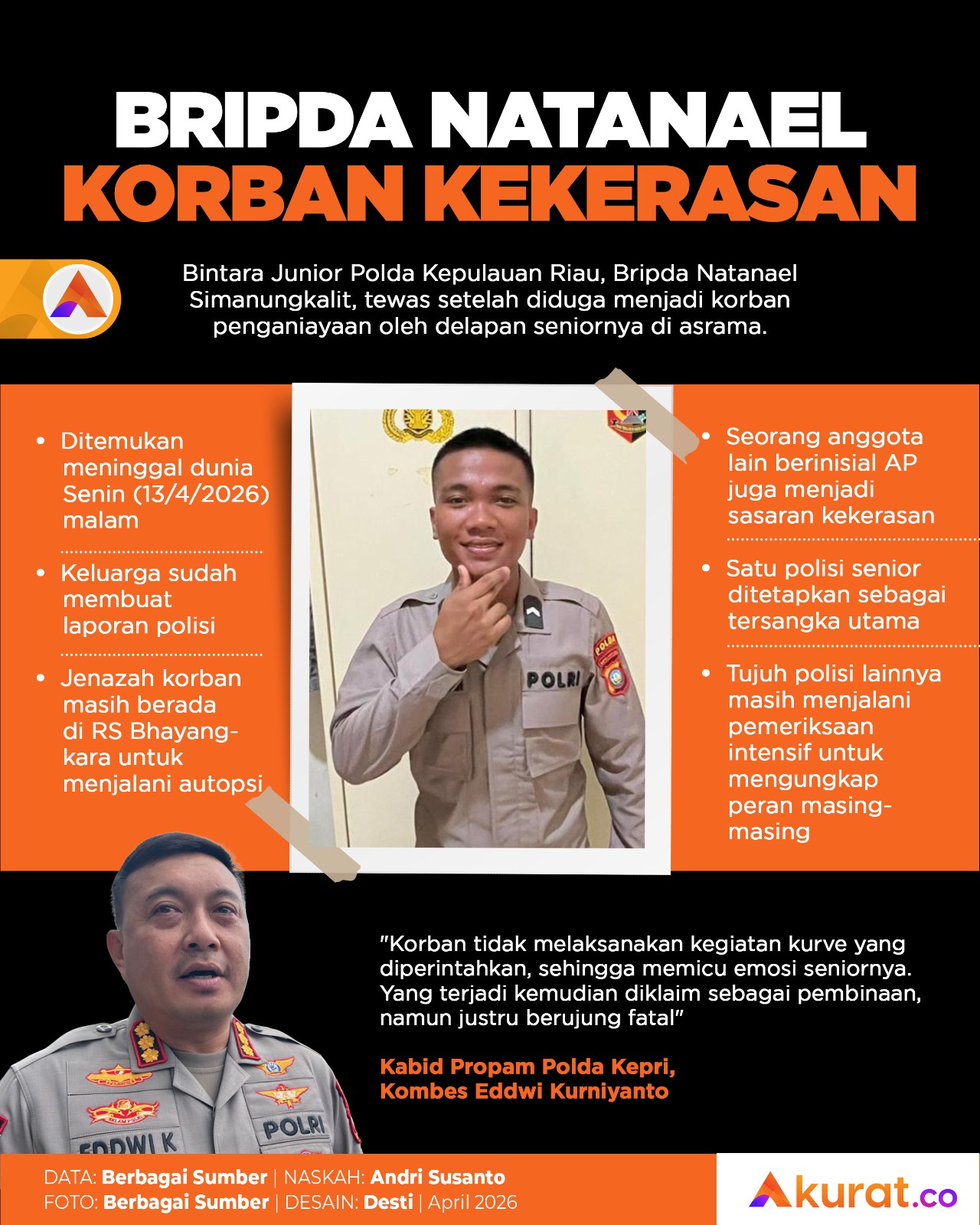 Bintara Junior Polda Kepulauan Riau, Bripda Natanael Simanungkalit, tewas setelah diduga menjadi korban penganiayaan oleh delapan seniornya di asrama.