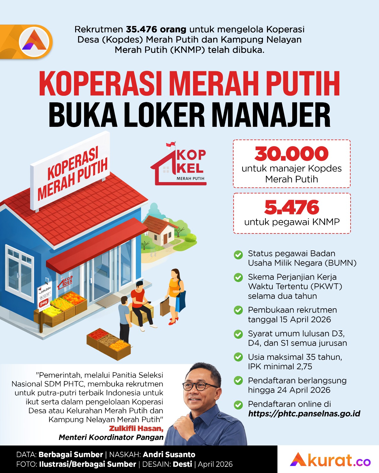 Rekrutmen 35.476 orang untuk mengelola Koperasi Desa (Kopdes) Merah Putih dan Kampung Nelayan Merah Putih (KNMP) telah dibuka.