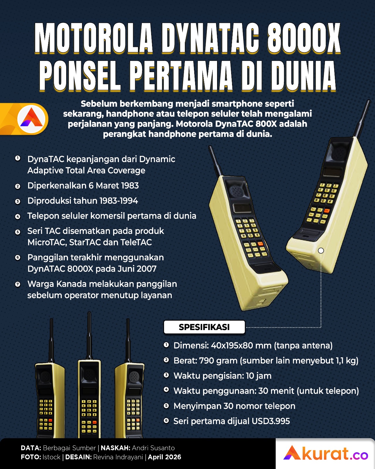 Motorola DynaTAC 8000X dikenal sebagai telepon seluler pertama di dunia.
