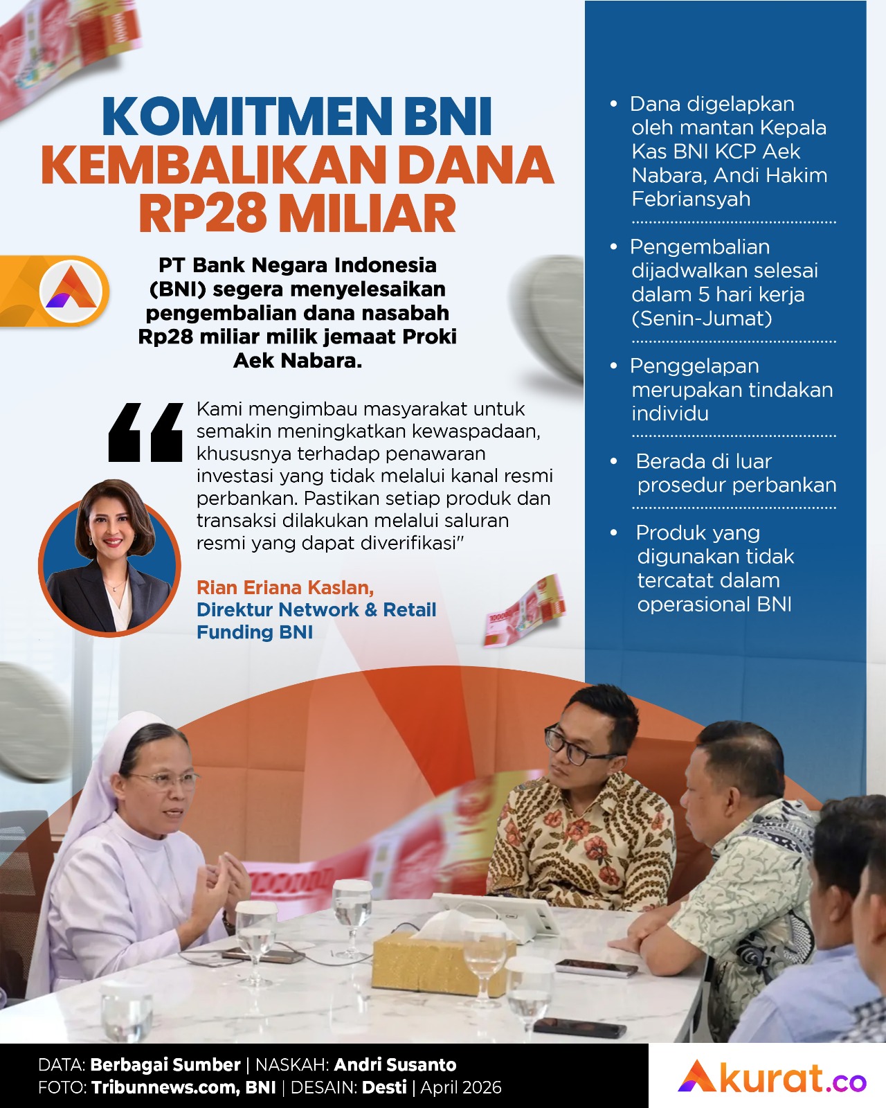 PT BNI berkomitmen segera menyelesaikan pengembalian dana nasabah Rp28 miliar milik jemaat Proki Aek Nabara.