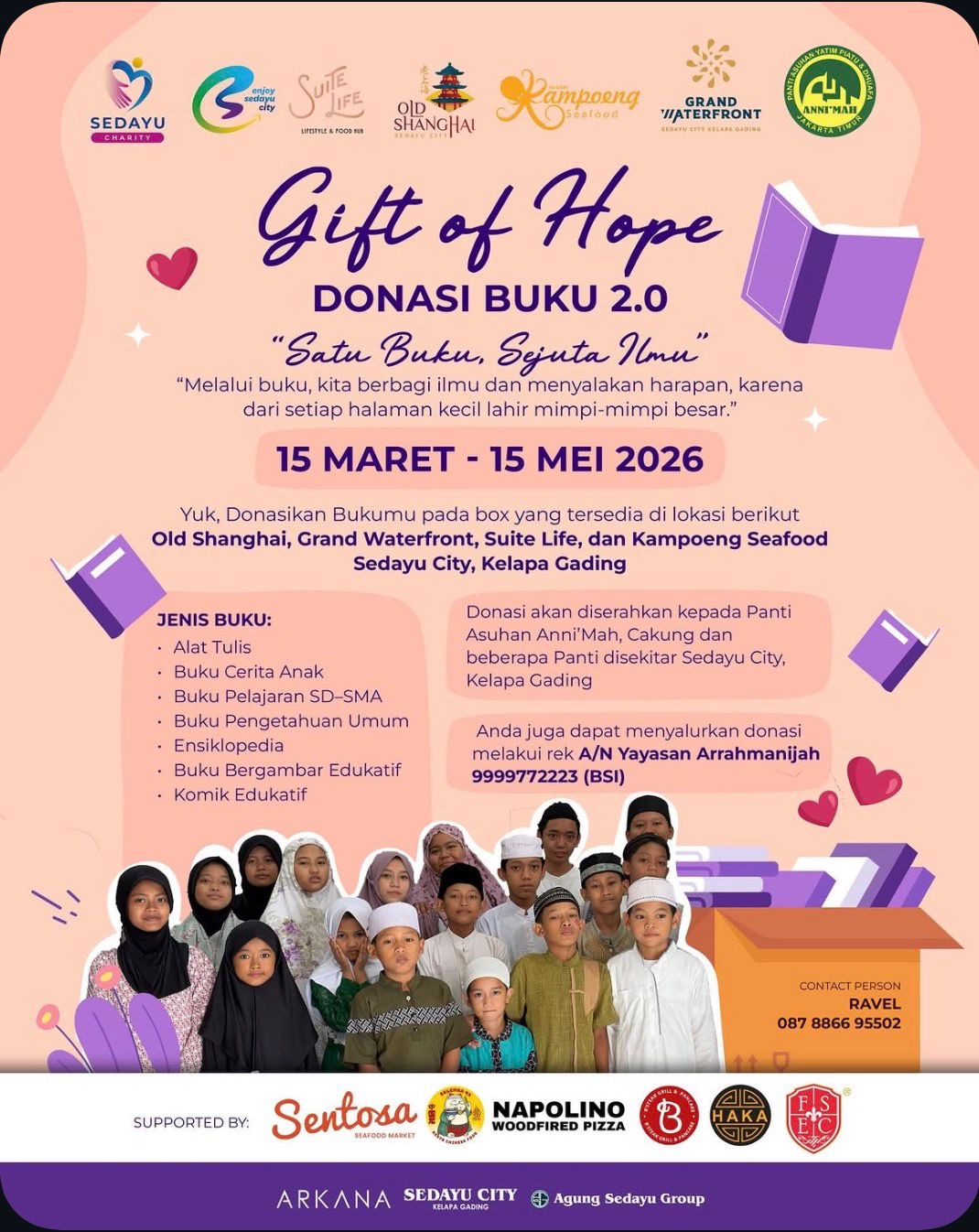 Selama periode 15 Maret hingga 15 Mei 2026, masyarakat diajak untuk menyumbangkan buku dan alat tulis di sejumlah titik, seperti Old Shanghai, Grand Waterfront, Suite Life, dan Kampoeng Seafood.